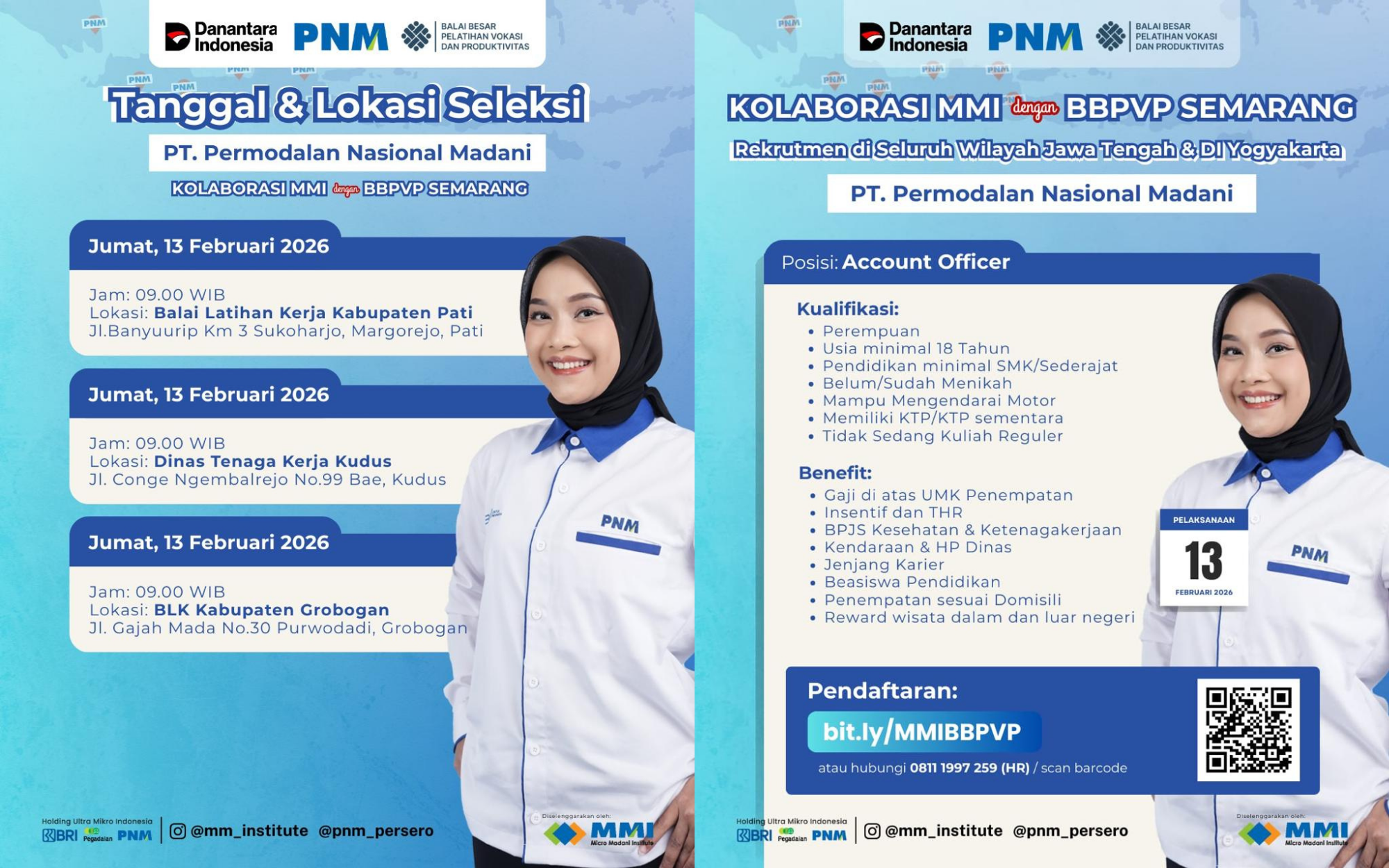 PT Permodalan Nasional Madani (PNM) membuka kesempatan berkarier sebagai Account Officer melalui kolaborasi MMI bersama BBPVP Semarang untuk wilayah Jawa Tengah dan DI Yogyakarta.