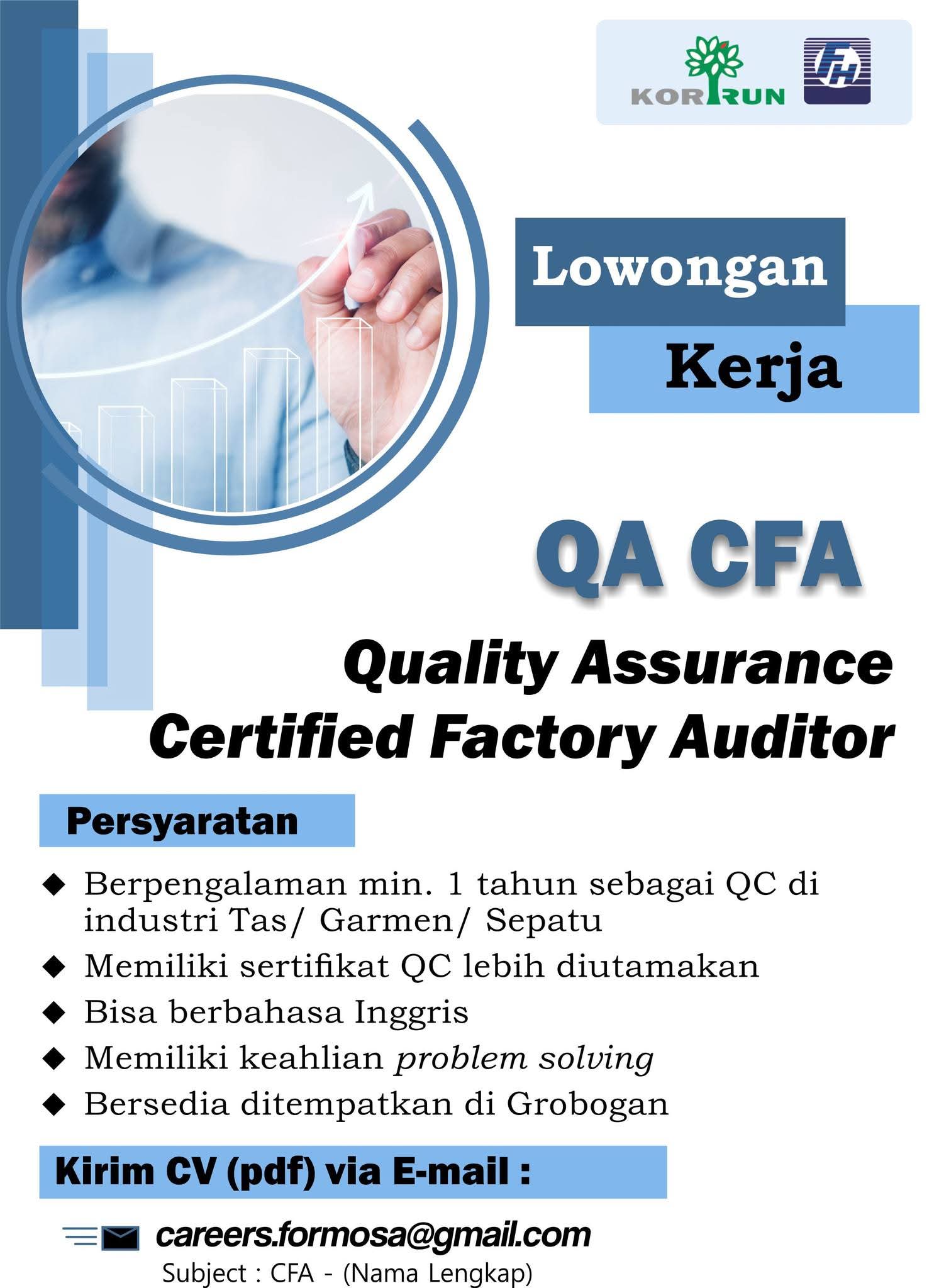 KORRUN bersama Formosa membuka kesempatan berkarier bagi profesional yang berpengalaman untuk bergabung sebagai QA CFA (Quality Assurance β Certified Factory Auditor). Posisi ini bertanggung jawab memastikan kualitas produksi dan melakukan audit standar kualitas di lingkungan pabrik.